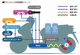 動力源として着脱可能なHonda Mobile Power Pack e: (以下、MPP) を採用し、車体サイズ、重量、出力、航続距離のバランスから本車両はMPPを2個を搭載し、96VのEVシステムを適用しています。(右上システム図参照)